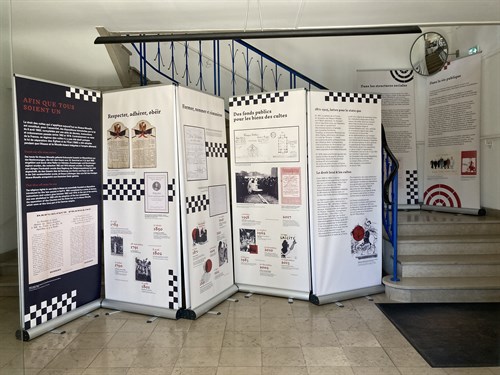 Les Archives d’Alsace mettent à la disposition des associations, établissements scolaires ou socio-culturels, communes, etc. la déclinaison itinérante de l'exposition. L'exposition itinérante "le Rouge et le Noir" se compose comme suit : 12 bâches Roll-Up 85 cm RECTO VERSO (2 faces) type Dragonfly2 - Support(s) : Bâche pleine 510g M1 - Impression : Quadri Recto + Verso - Format : 85x200 cm - Conditionnement : Individuel - Montage de la Bâche dans la Structure Emprunter l'exposition itinérante