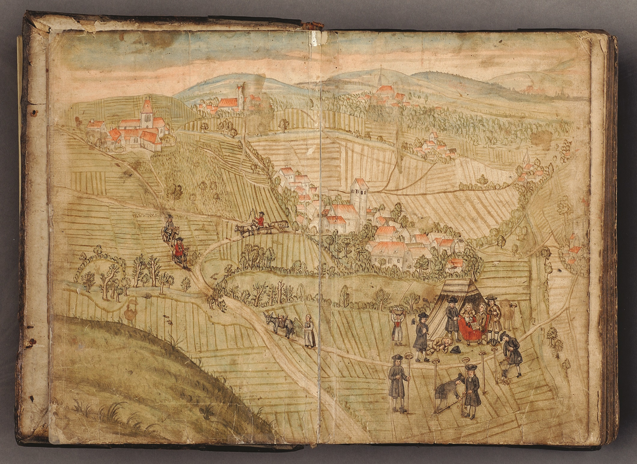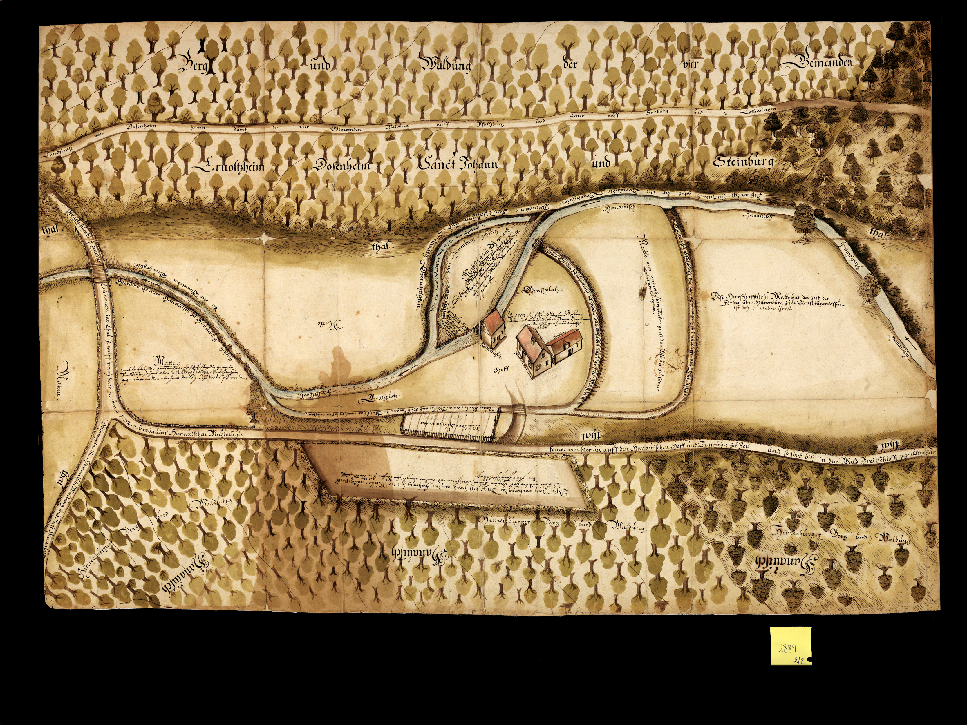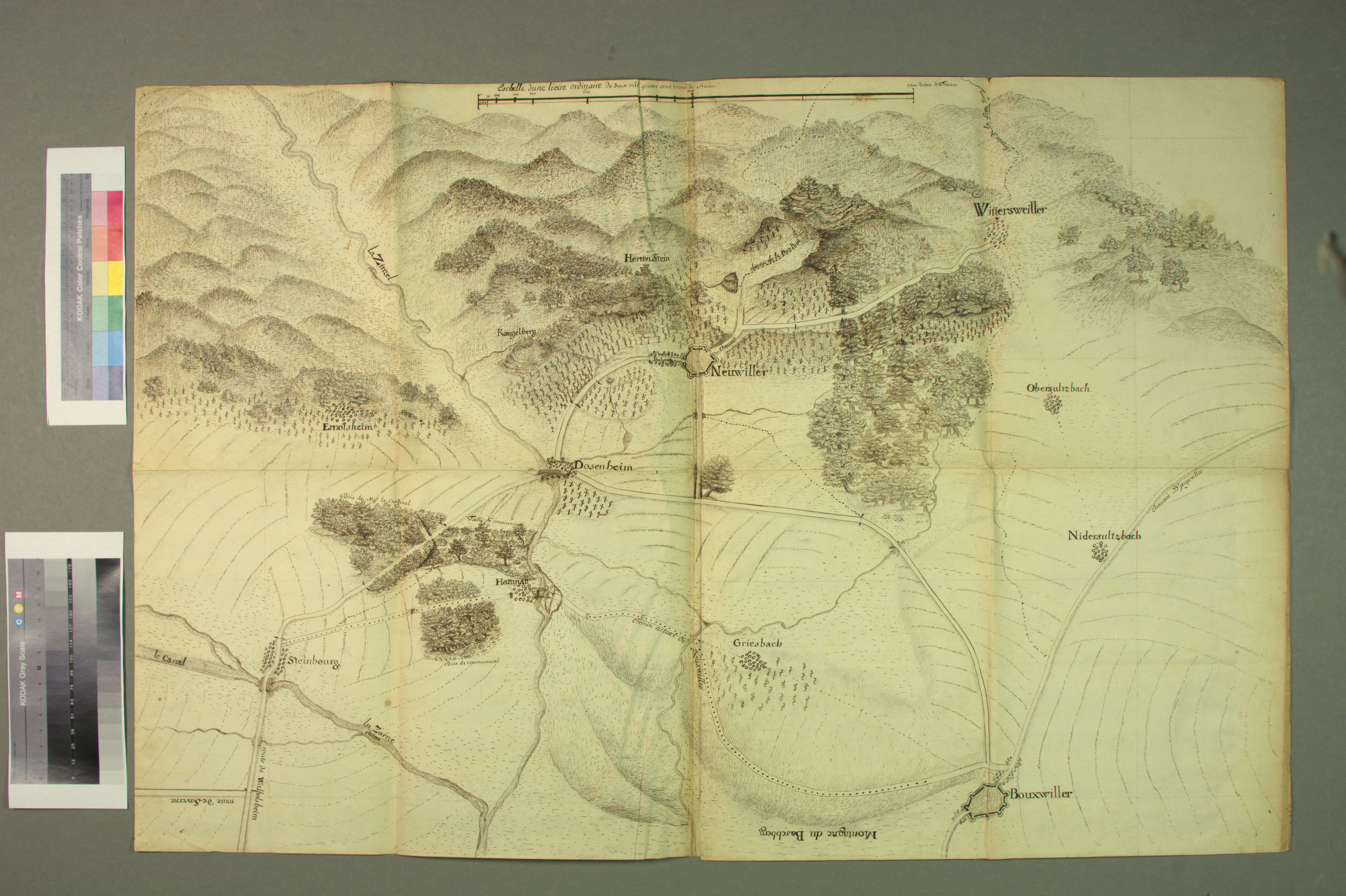 Vue panoramique des environs de Neuwiller-lès-Saverne, avec les communautés voisines, les routes reliant les localités, les forêts et les vignobles, seconde moitié du XVIIIe siècle.