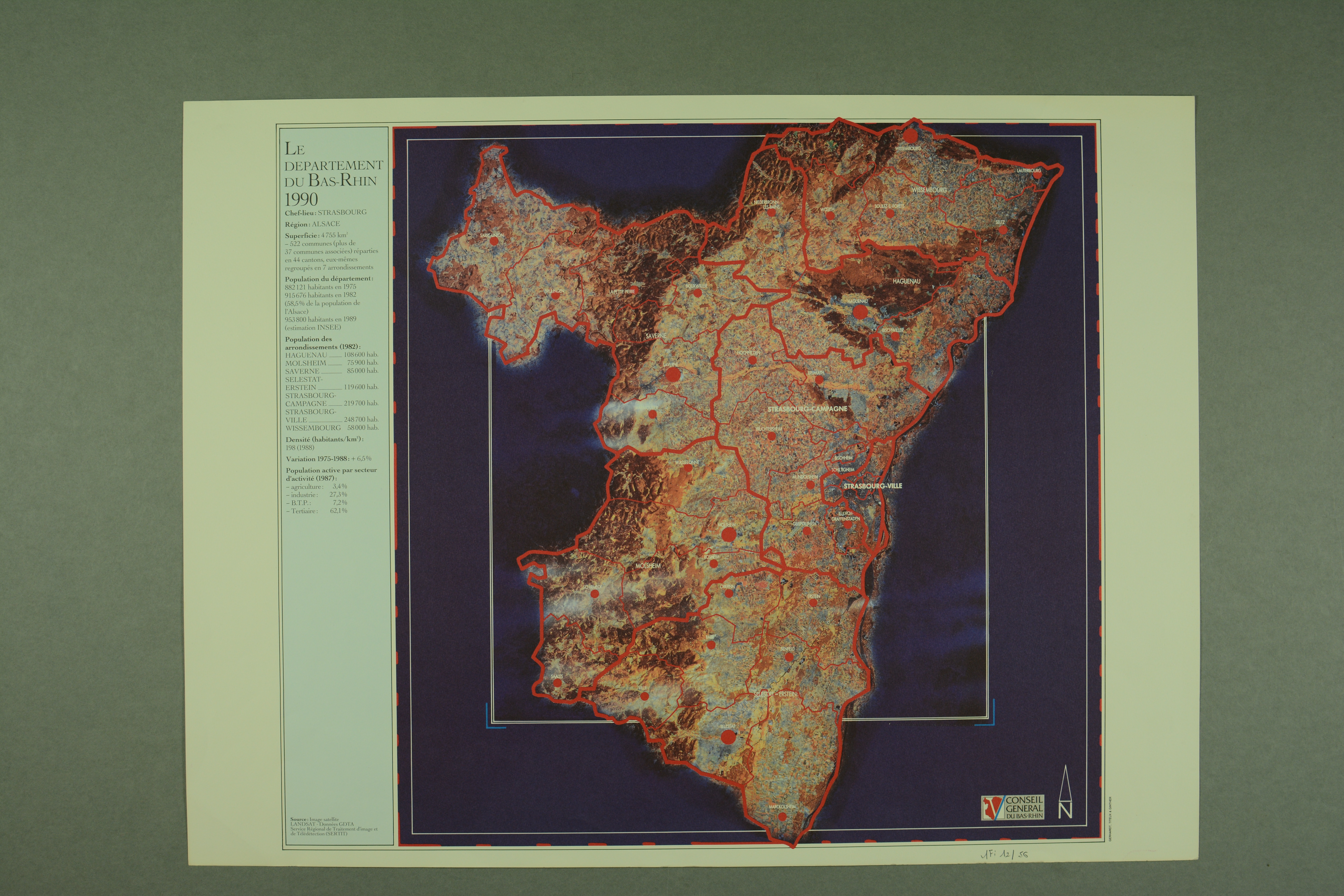 Photographie satellite du Bas-Rhin, Landsat – données du Groupement pour le développement de la télédétection aérospatiale (GDTA). Service régional de traitement d’image et de télédétection (SERTIT) – Université de Strasbourg, 1990
