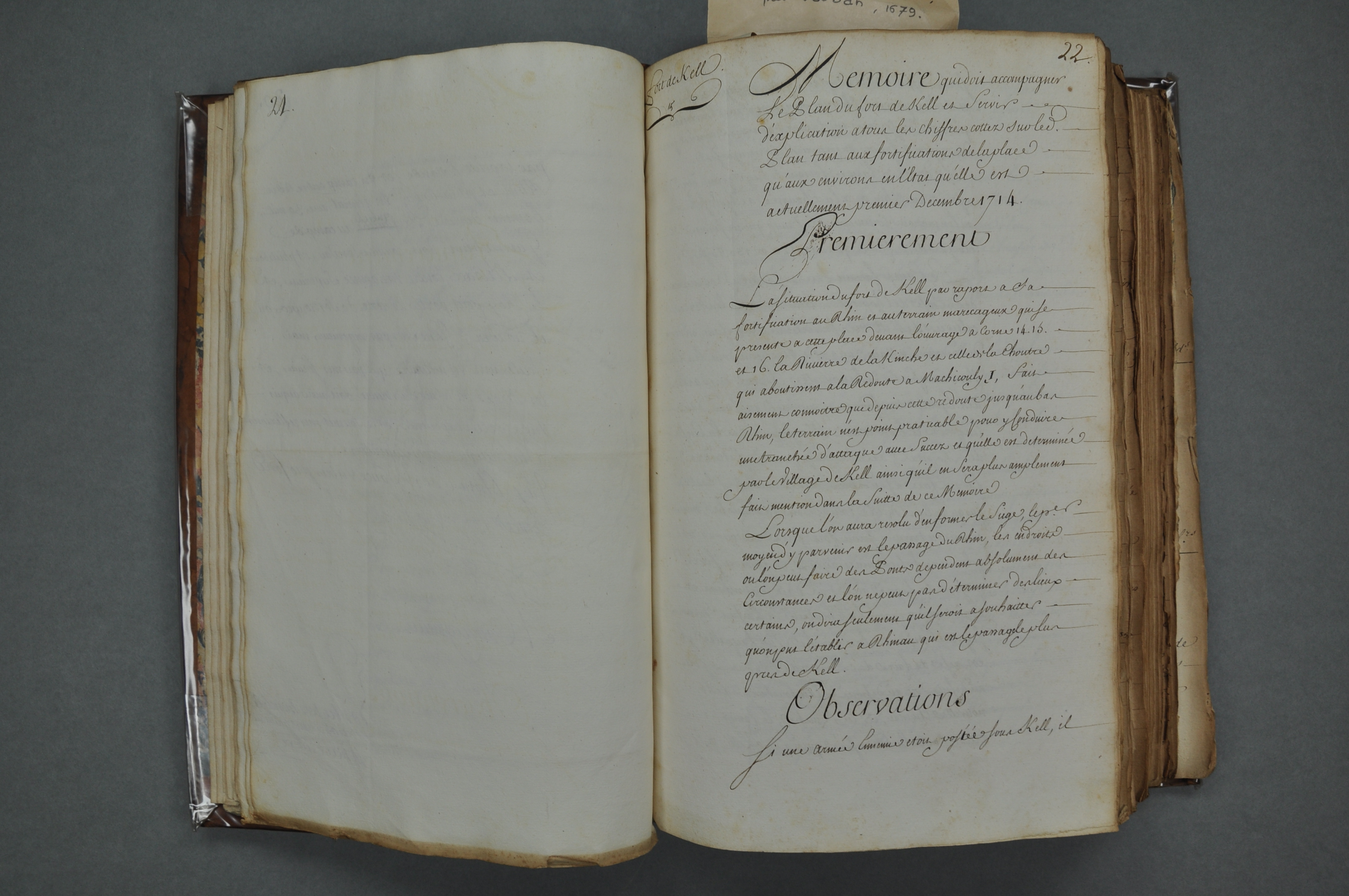Première page du Mémoire accompagnant le plan des fortifications de Kehl, 1712, conservé dans un recueil factice de mémoires et de pièces politiques concernant principalement la Lorraine, l'Alsace, le Palatinat, la plupart en copies, XVIIIe siècle, en trois volumes