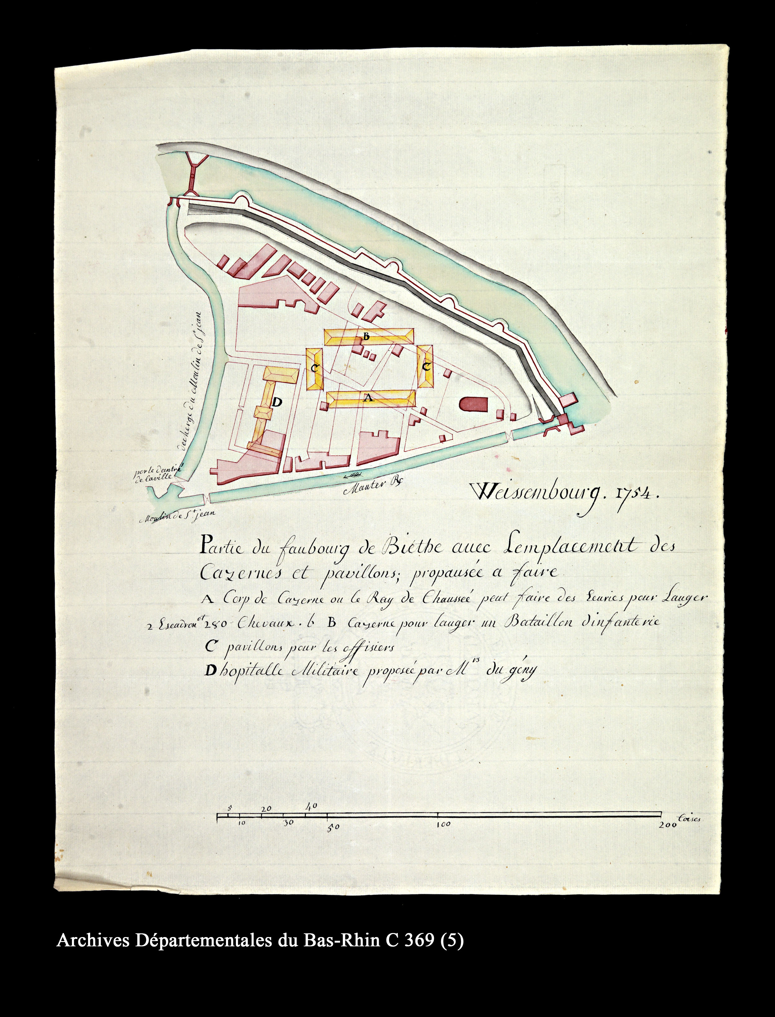 Plan des fortifications de Wissembourg au niveau du faubourg de Bitche, avec l’emplacement des casernes et pavillons militaires projetés, plume et lavis couleur, 1754