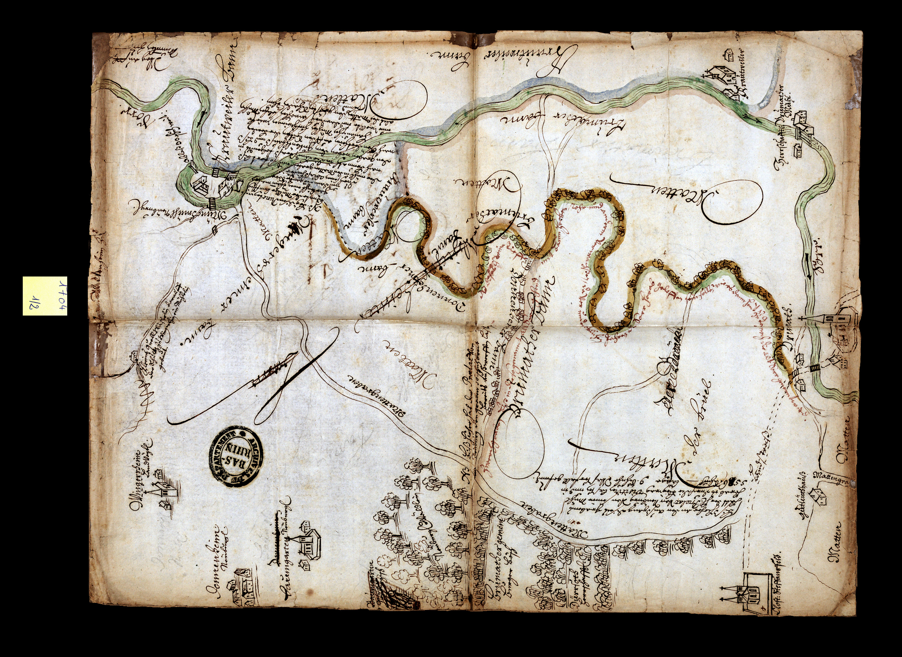 ADBR E 1704. - Dans ce litige l’opposant au comte de Hanau-Lichtenberg, l'abbaye de Neubourg se considère lésée dans la possession de ses prés, au travers desquels on a fait passer la Zorn. Le cours modifié de la rivière est en vert et bleu, tandis que la « vieille Zorn » est identifiée par un trait rehaussé de jaune et de vert. Les deux plans montrent le même espace et portent la même date.