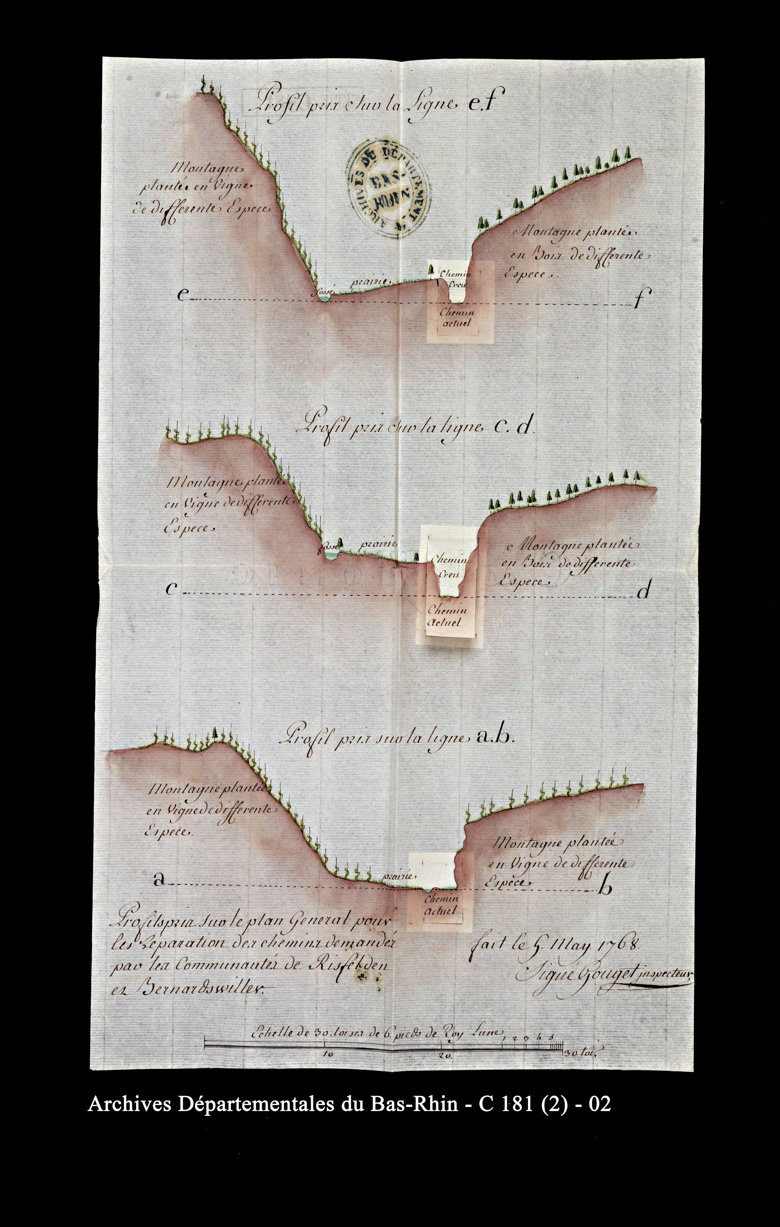 Chemins entre Reichsfeld et Bernardvillé : trois profils pris sur le plan général, dressés en vue des réparations des chemins, 1768