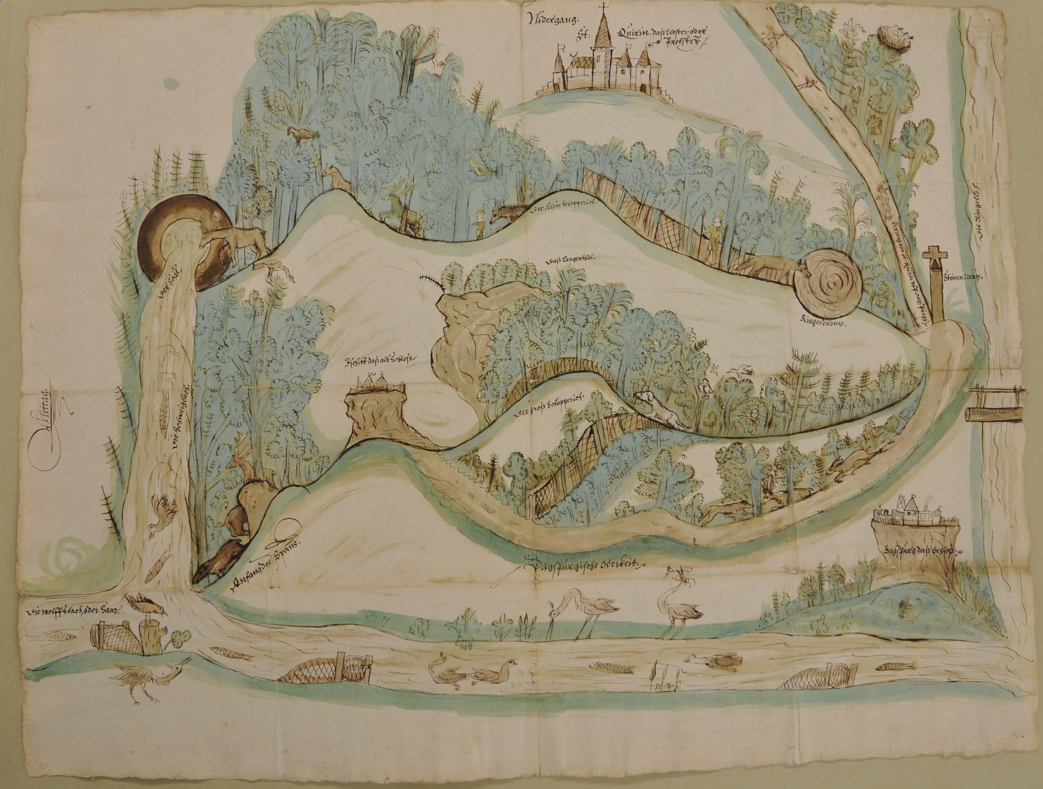ADBR G 735/PLAN. - Ce plan est inclus dans la convention réglant le différend territorial entre les comtes de Linange-Dabo et les Bénédictins de Saint-Quirin, dans la forêt dite du Streitwald (« Bois de la Querelle ») : il fixe la frontière entre les deux domaines. Toute la faune vosgienne, ou presque, est représentée : héron, ours, loup, renard, canard, poissons, coq de bruyère, cerf, chevreuil, cigogne, lièvre…