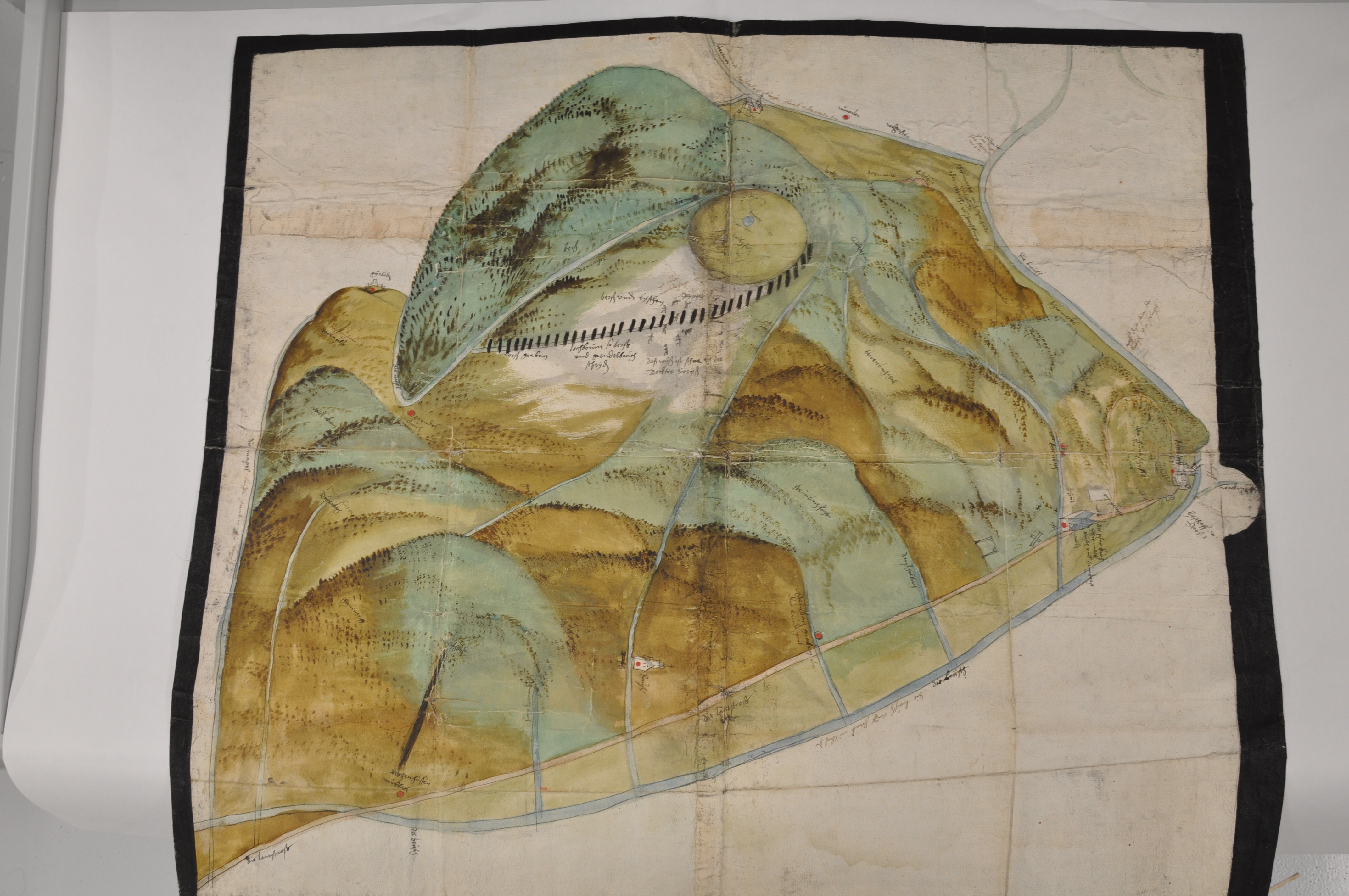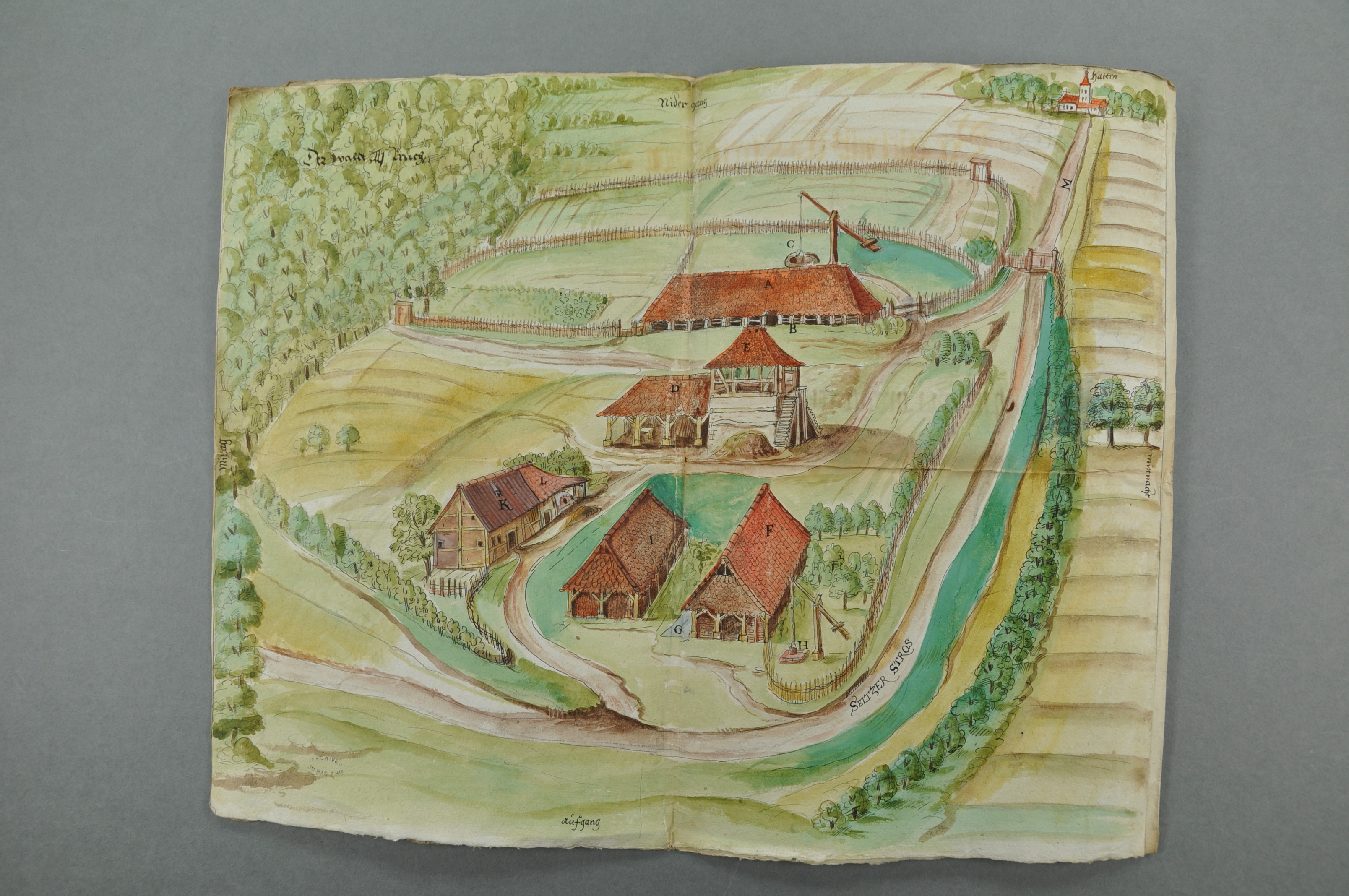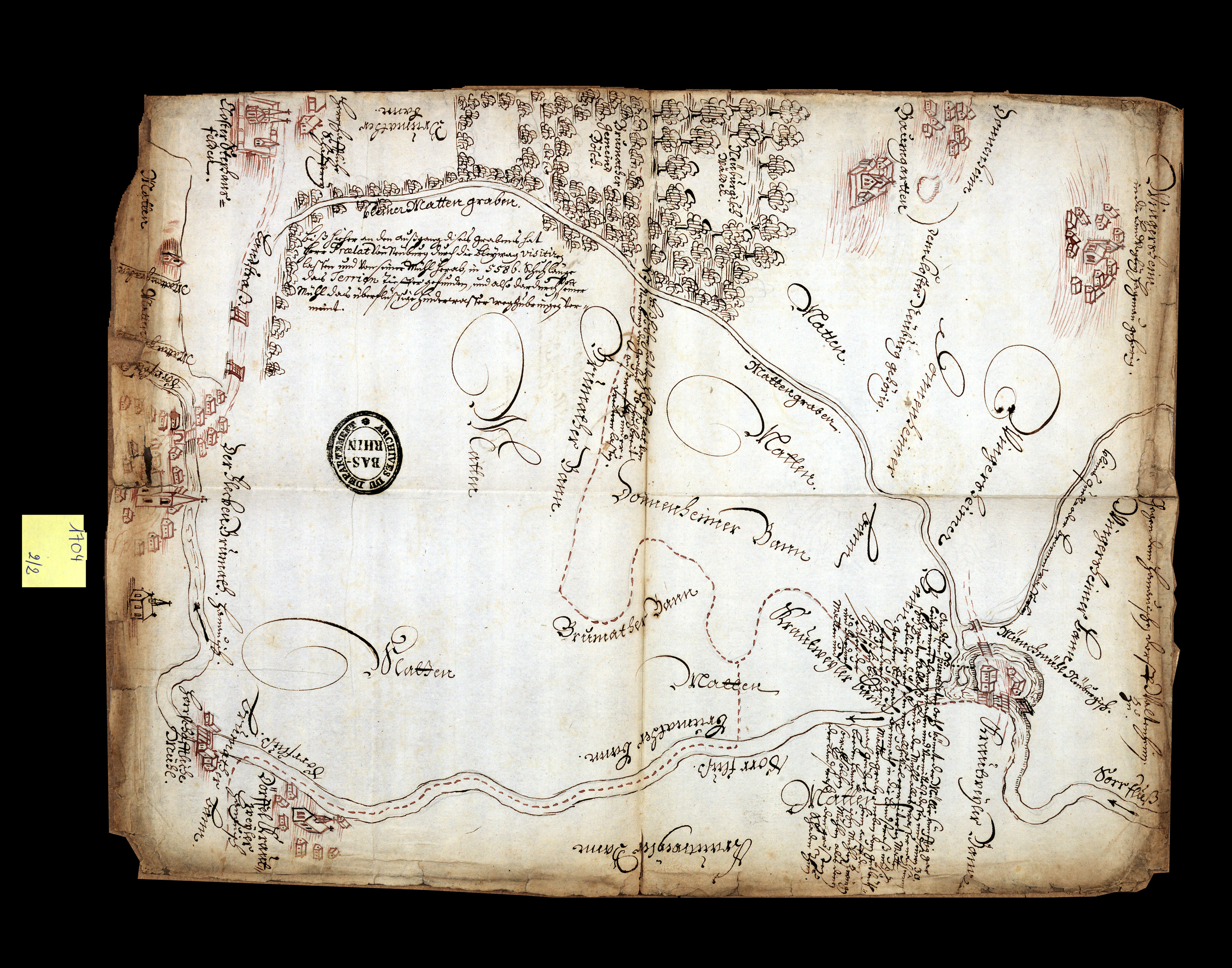 ADBR 3 B 1546/1. - Le luxe de détails et le soin de l’exécution font de ce document un élément essentiel dans la défense du comte, qui souhaite faire reconnaître son bon droit dans le conflit qui l’oppose aux quatre grands villages du Hattgau : ces derniers lui demandent de réduire la production de sa tuilerie, agrandie récemment, aux dimensions antérieures, de démolir le hangar neuf et de ne pas livrer de briques, de chaux et de tuiles hors du pays du Hattgau.