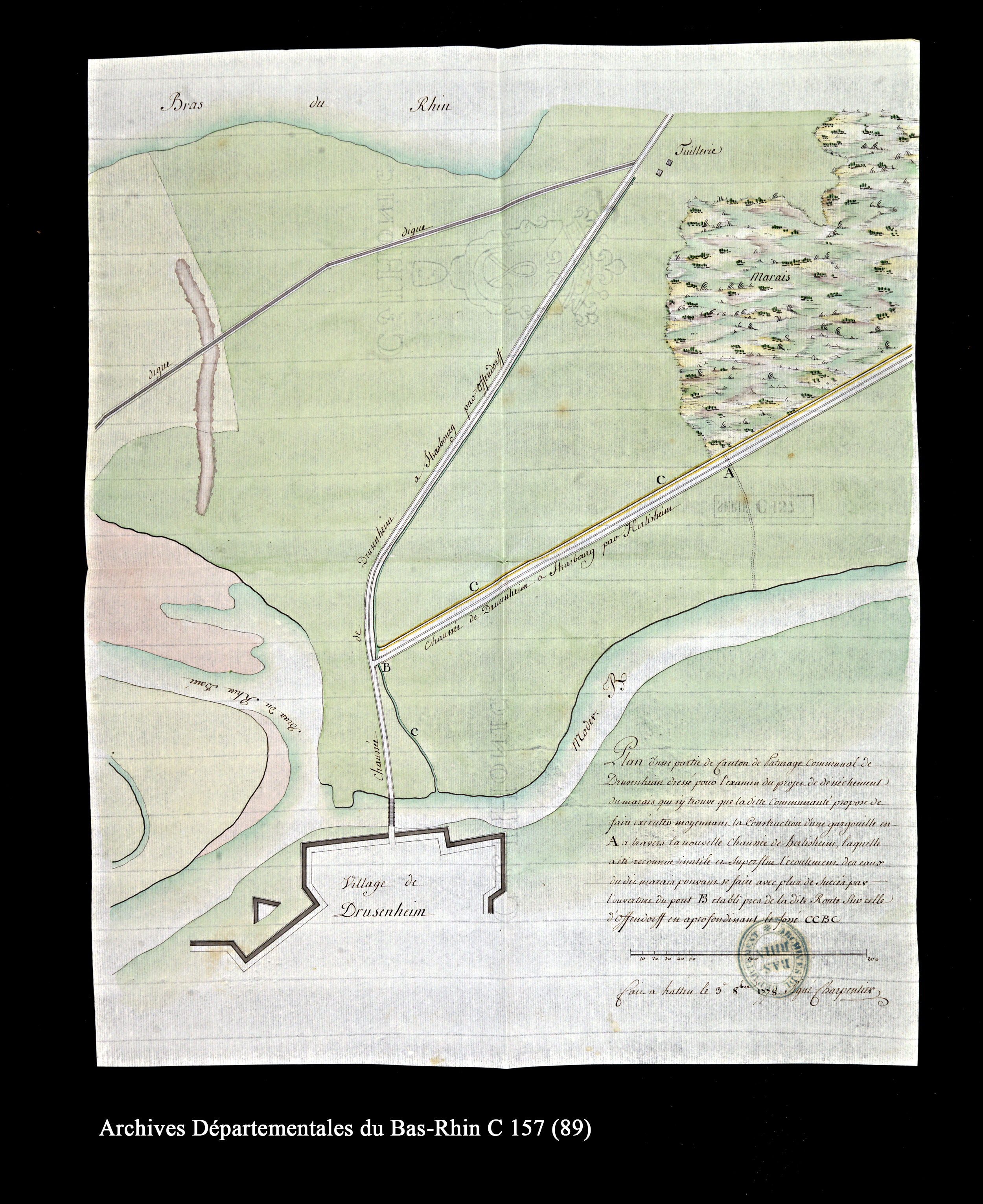 Plan d'une « partie de canton de pâturage communal de Drusenheim », dressé pour l'examen du projet de desséchement du marais qui s'y trouve, 1778