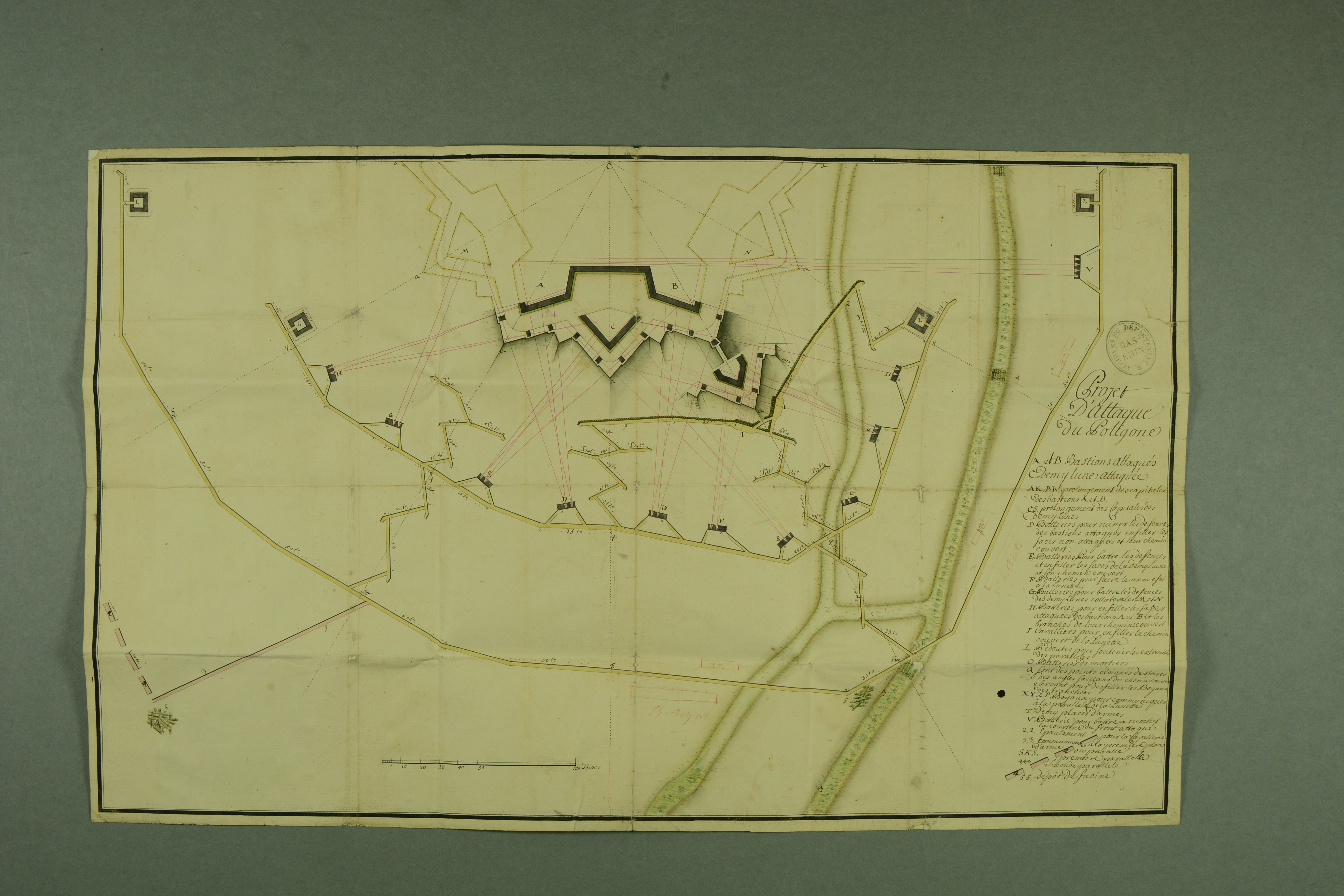 Projet d'attaque du terrain militaire du Polygone à Strasbourg, plume et lavis couleur, XVIIIe siècle