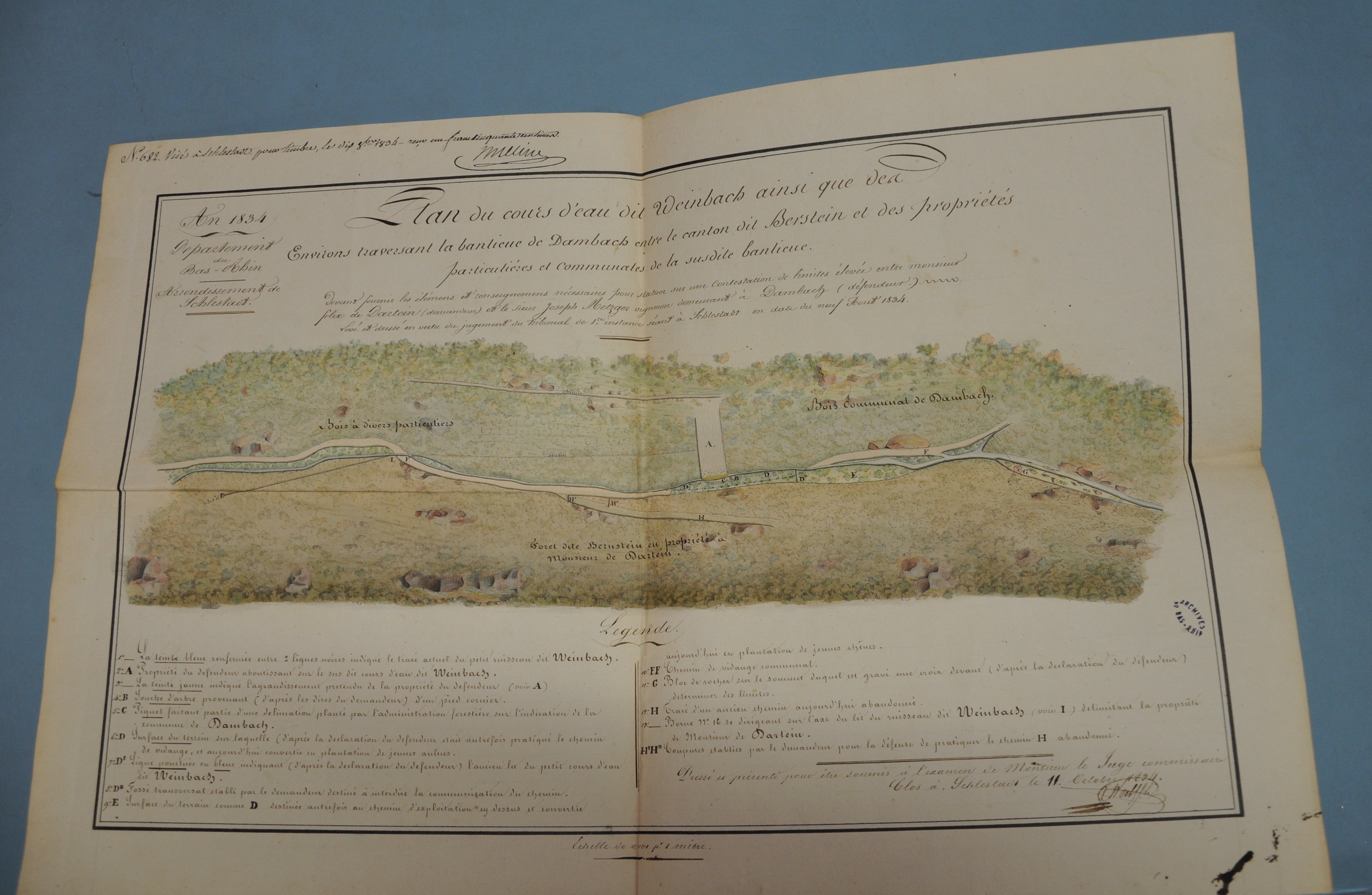ADBR U 390. - Le plan est « levé et dressé » en vertu du jugement du tribunal de première instance de Sélestat rendu le 9 avril 1834, pour être « soumis à l’examen de Monsieur le juge commissaire ». Les jeux de couleur confèrent à la carte un certain esthétisme, sans que cela nuise à la précision des indications géographiques.