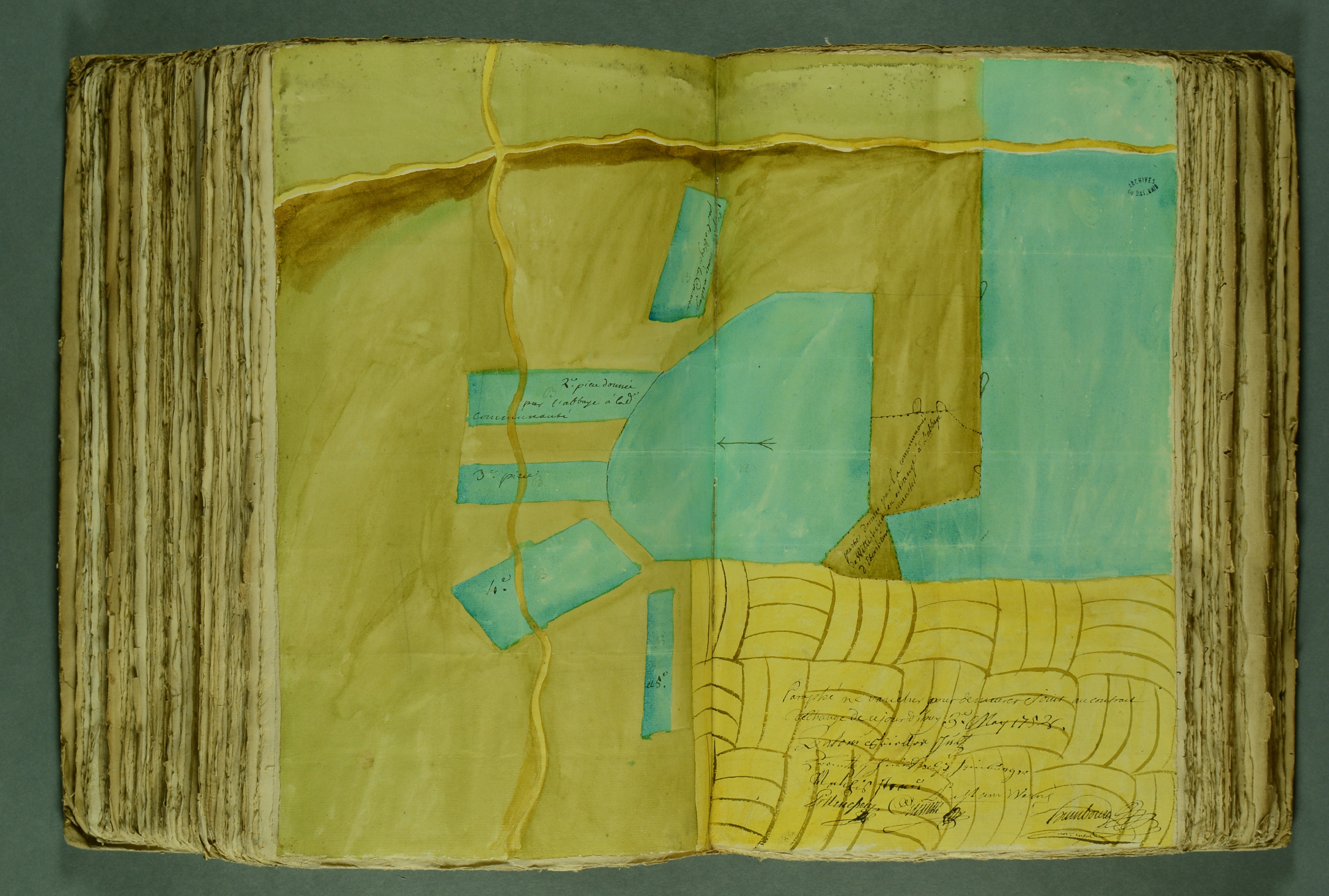 ADBR 6 E 41/87. - Plan à l’appui de l’échange de biens entre la communauté de Wittisheim et l’abbaye d’Ebersmunster, daté du 3 mai 1752, (fonds du notariat de Strasbourg).