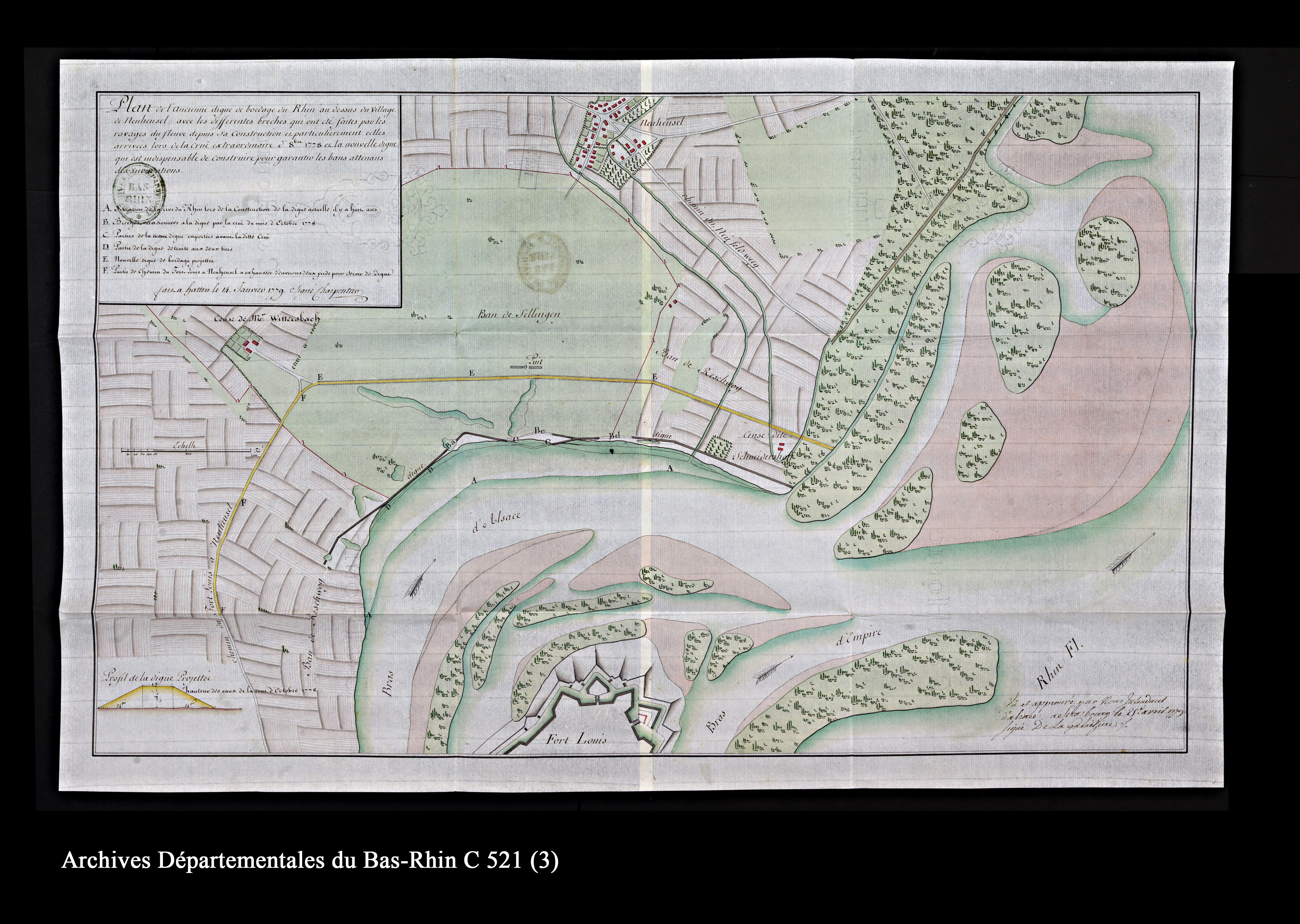 Plan de l'ancienne digue de bordage du Rhin, au-dessus du village de Neuhaeusel, avec les différentes brèches provoquées « par les ravages du fleuve depuis sa construction et particulièrement celles arrivées lors de la crue extraordinaire d'octobre 1778 », 1779