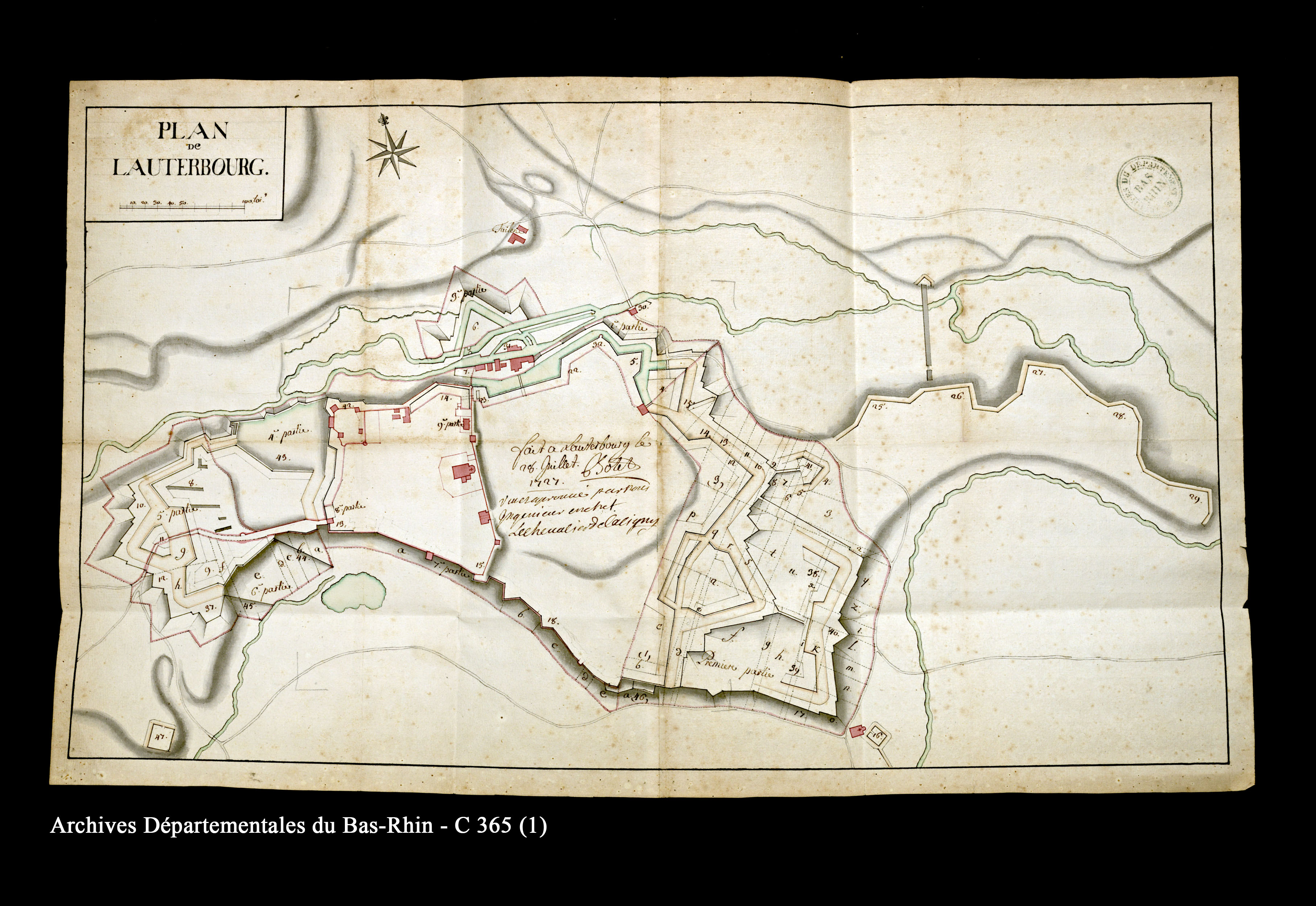 Plan des fortifications de Lauterbourg, plume et lavis couleur, 18 juillet 1721