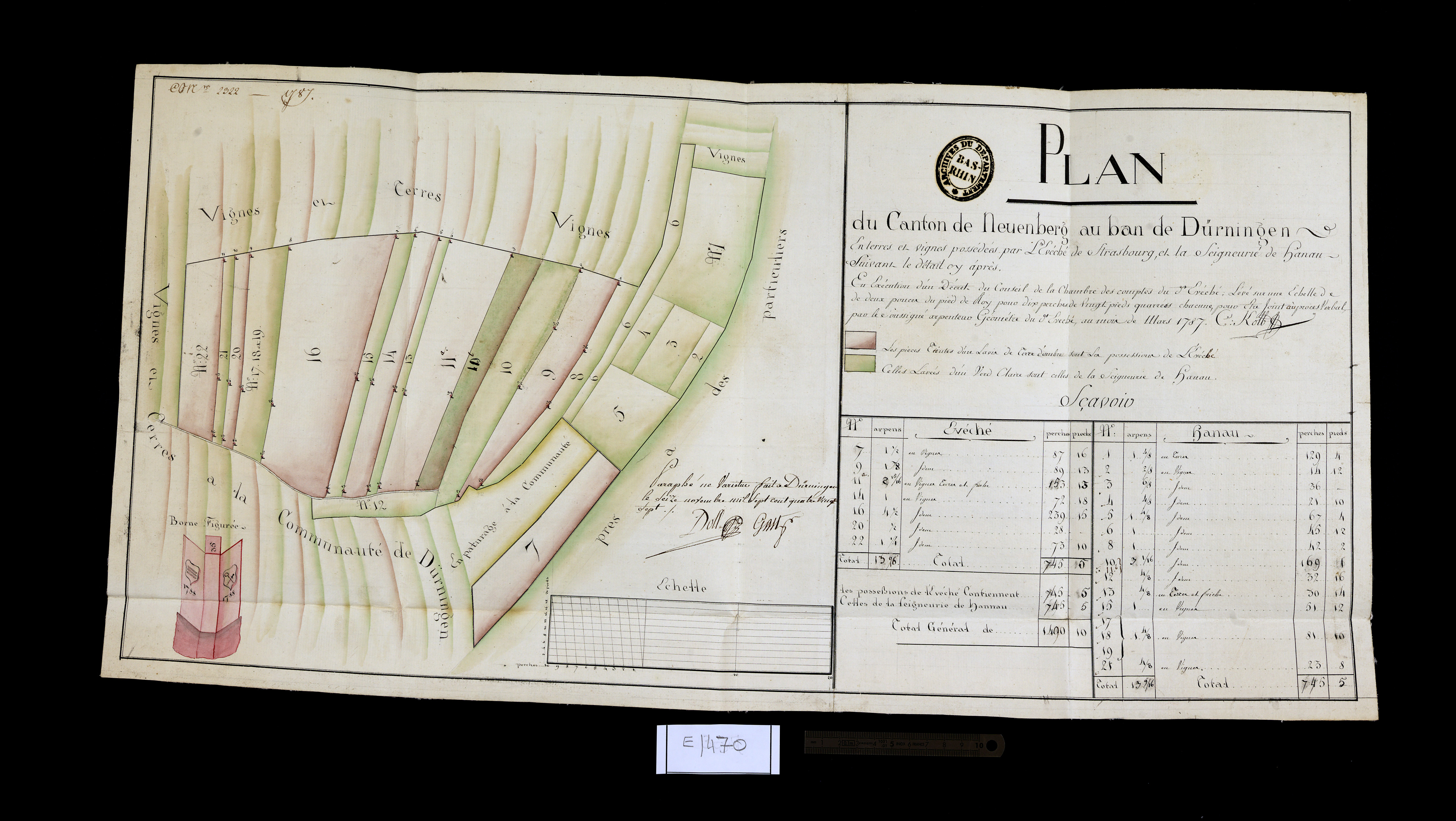 « Canton » de Neuenberg, à Durningen, partagé entre l'évêché de Strasbourg et la seigneurie de Hanau, avec la statistique des cultures, 1787