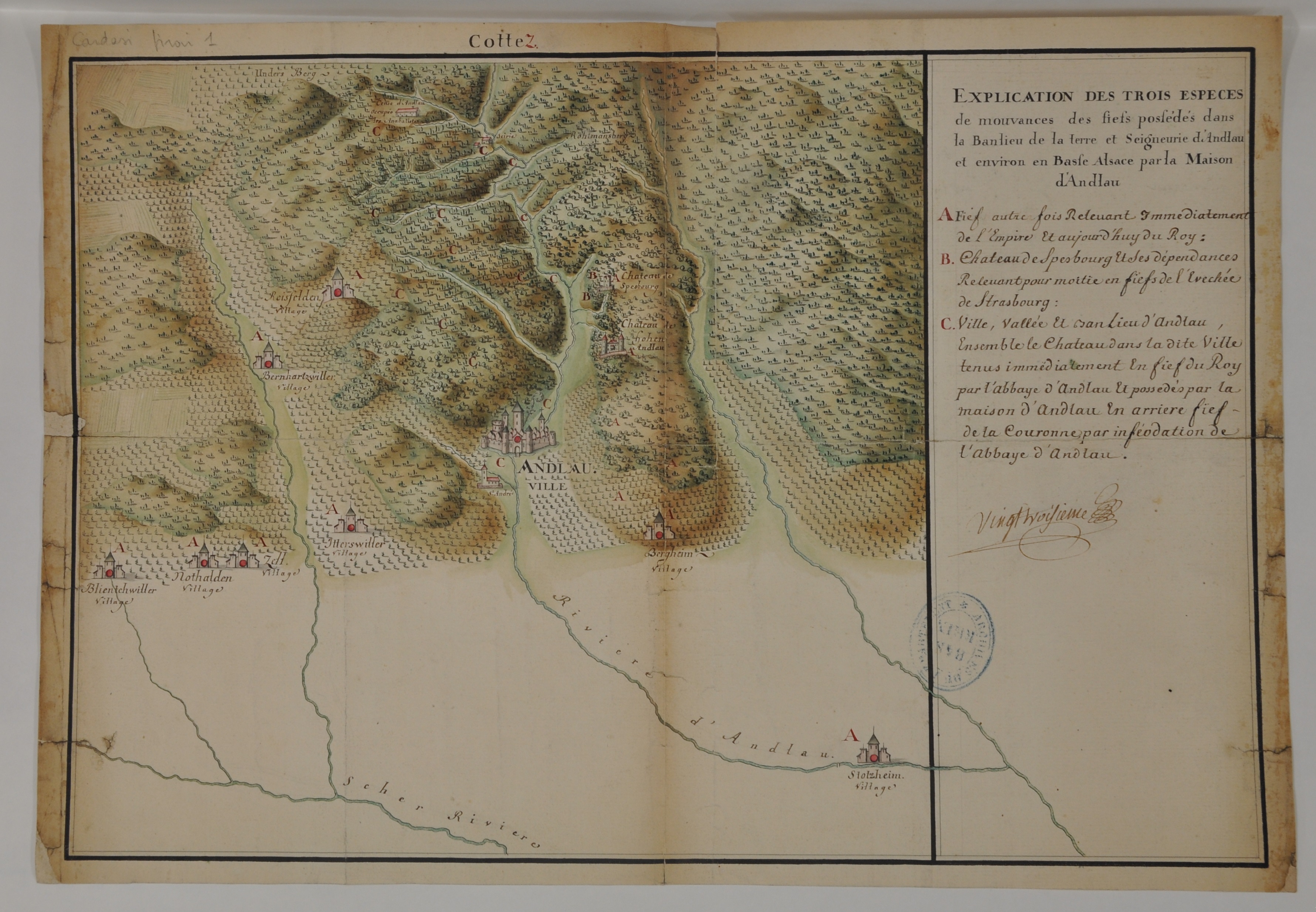 ADBR C 266/98. - Ce plan représente les différents liens féodaux dont relèvent les biens et possessions de la famille d’Andlau dans la banlieue d’Andlau. Le soin apporté à la représentation des bâtiments, qu’il s’agisse des châteaux d’Andlau et du Spesbourg, des remparts de la ville et de l’église Saint-André, ou encore de la scierie et de la cense anabaptiste, se retrouve aussi dans la précision avec laquelle l’étendue des vignobles et des forêts est dessinée.
