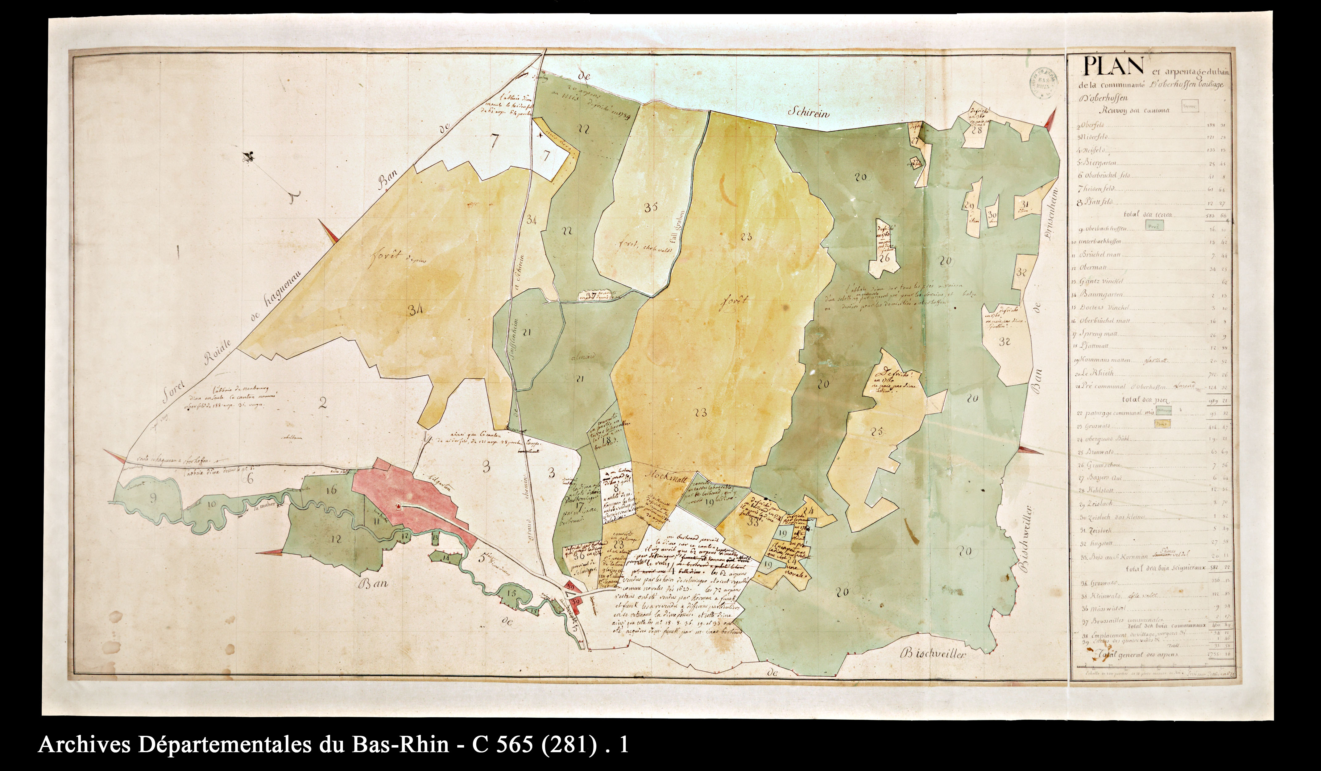 ADBR C 570/425. - Le plan représente la limite et la superficie des terrains composant le finage et leur répartition par nature d’exploitation (champs, prairies, vignobles et forêts). Exemple tiré de la collection de 500 plans d’arpentage des finages ordonnés par l’intendant d’Alsace vers 1760 et couvrant 436 communes de la province (78 % de l’actuel département du Bas-Rhin), il fournit quantité d’informations sur la topographie, la toponymie, les activités économiques, les bâtiments civils et religieux et l’habitat. Tous les arpenteurs ne reportent pas les mêmes éléments entre la minute et la version définitive du plan, chacun ayant ses propres habitudes de travail.