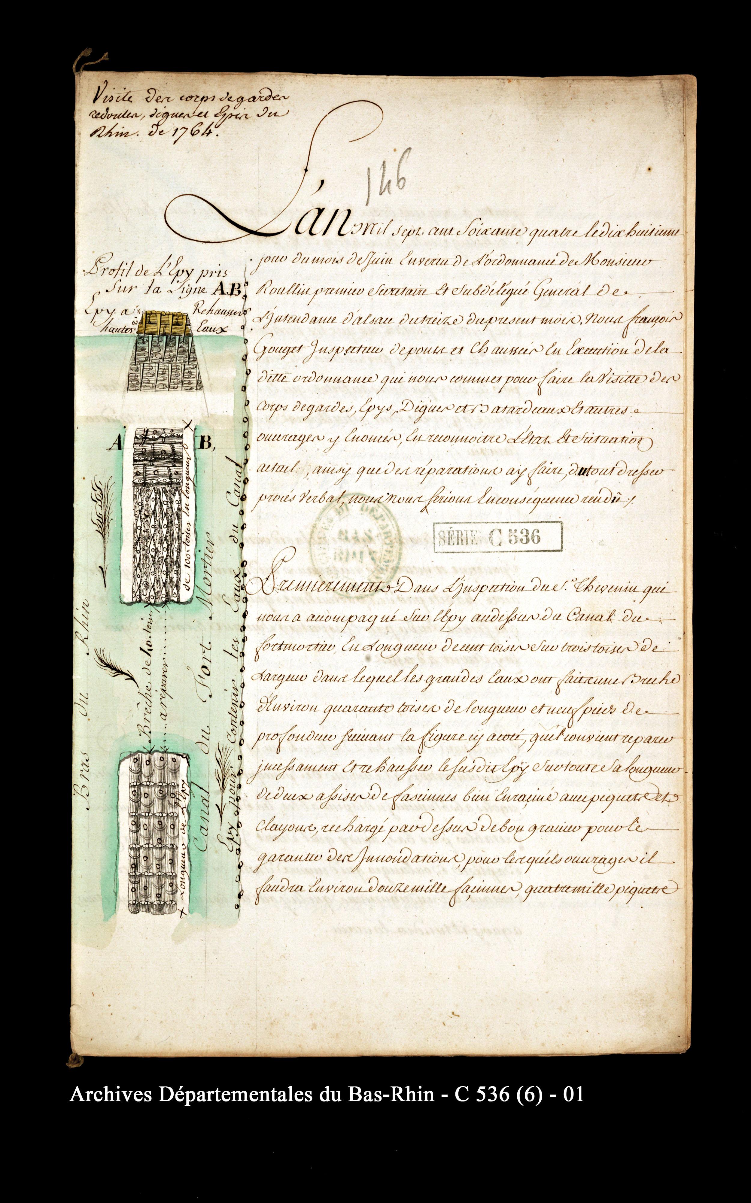 Plan et profil d’un épi à réhabiliter sur une partie du cours du canal du Fort Mortier et du bras du Rhin à proximité de Volgelsheim, 1764