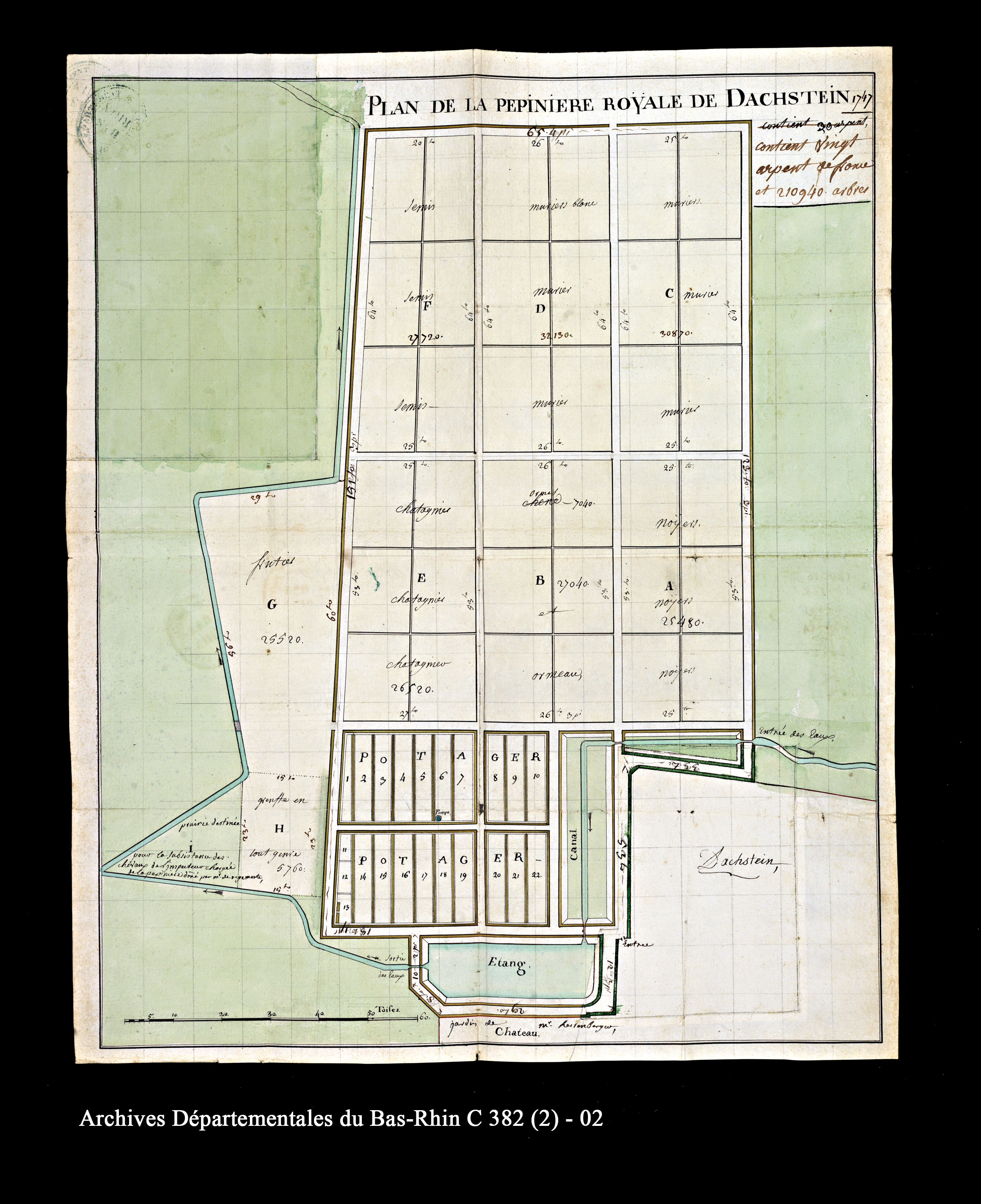 ADBR C 382 (pièce n°2/2). - Réserve arboricole créée en 1742 par l’intendant d’Alsace Paul-Esprit Feydeau de Brou, la pépinière a pour fonction première de fournir en arbres les bordures des routes alsaciennes.
