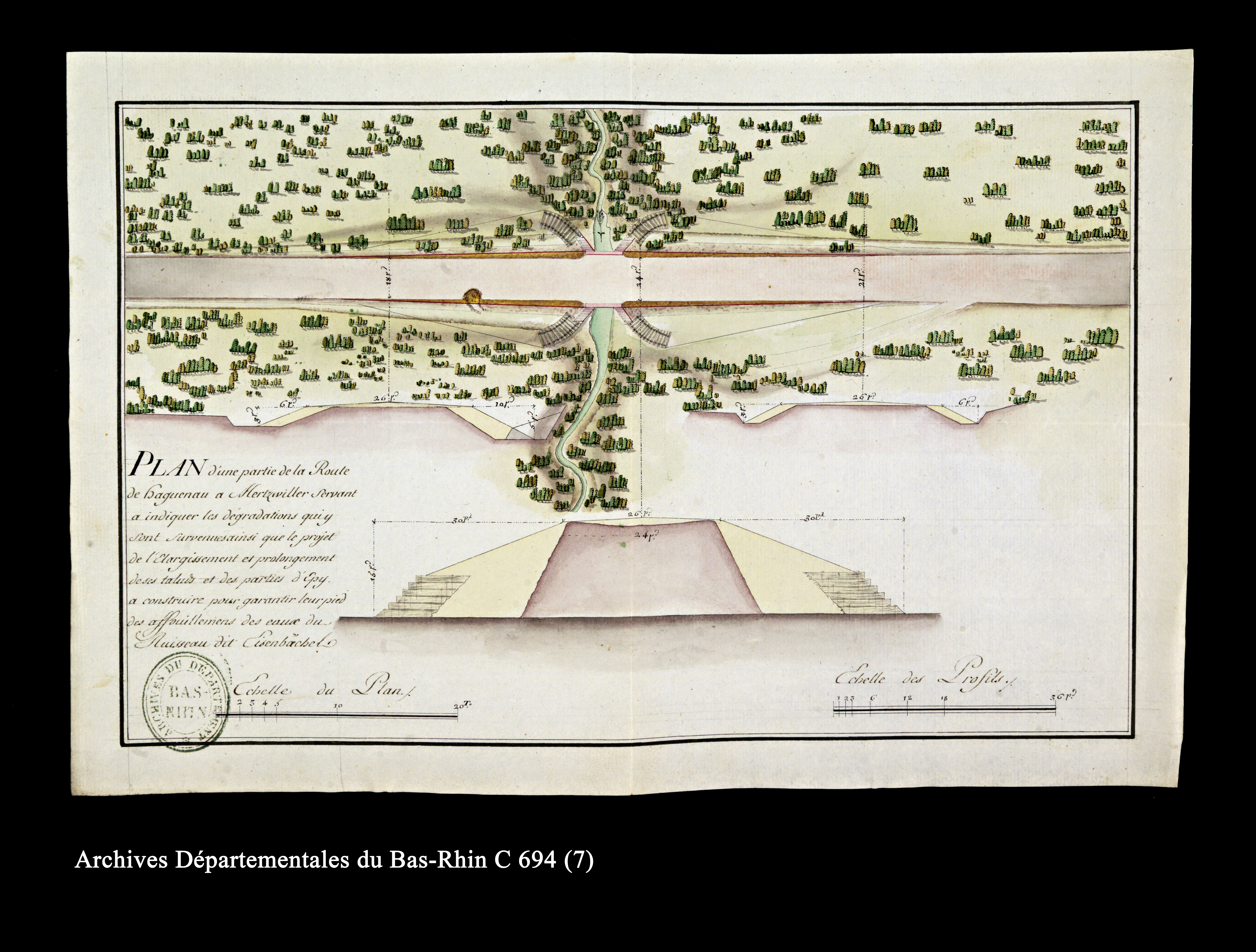 ADBR C 694 (pièce n°7). - « Servant à indiquer les dégradations qui y sont survenues, ainsi que le projet de l'élargissement et prolongement de ses talus et des parties d'épi à construire pour garantir leur pied des affouillements des eaux du ruisseau dit Eisenbächel ». La cartographie des routes est désormais considérée comme un préalable indispensable aux travaux, comme en témoigne le soin apporté aux profils et aux calculs de distance.