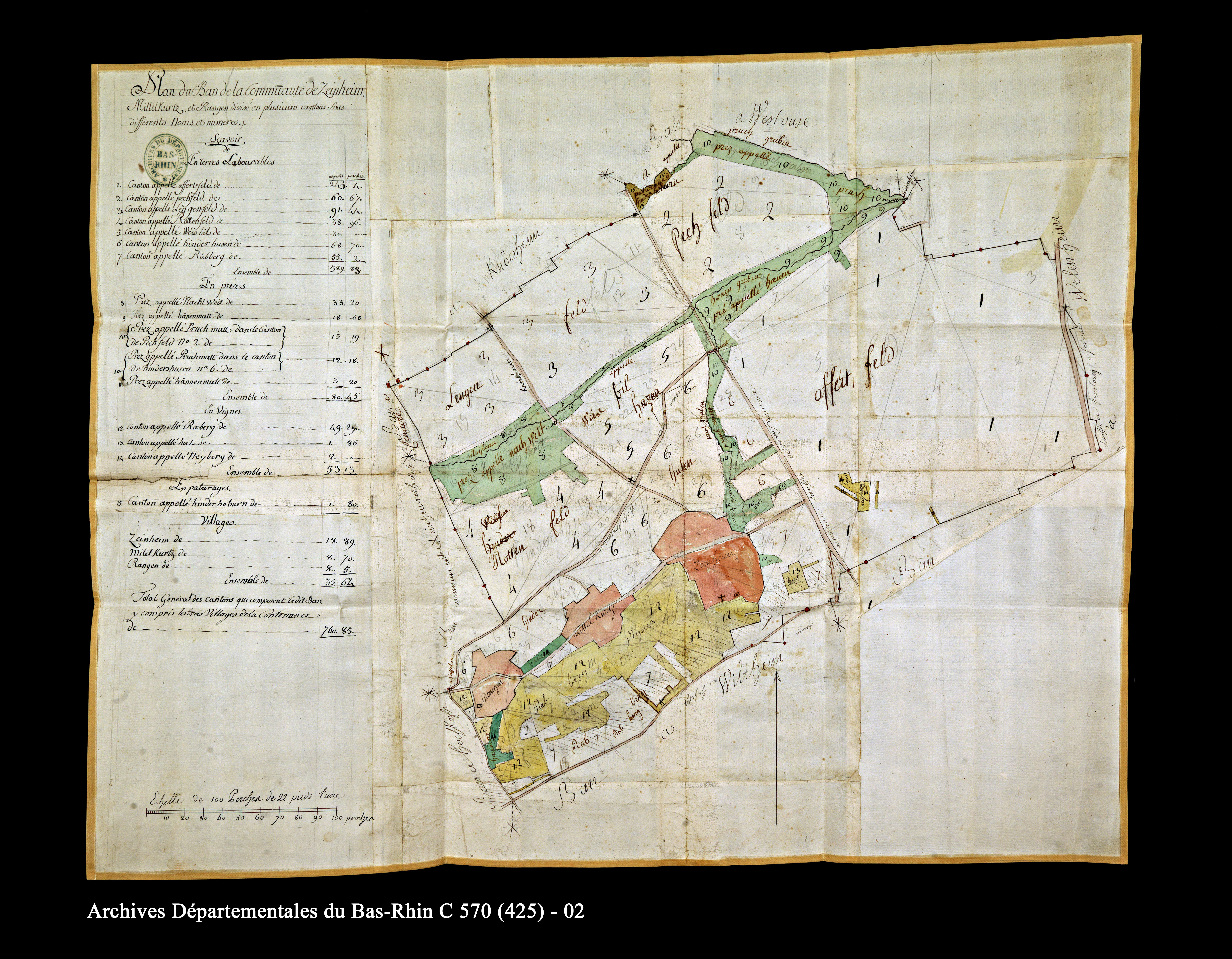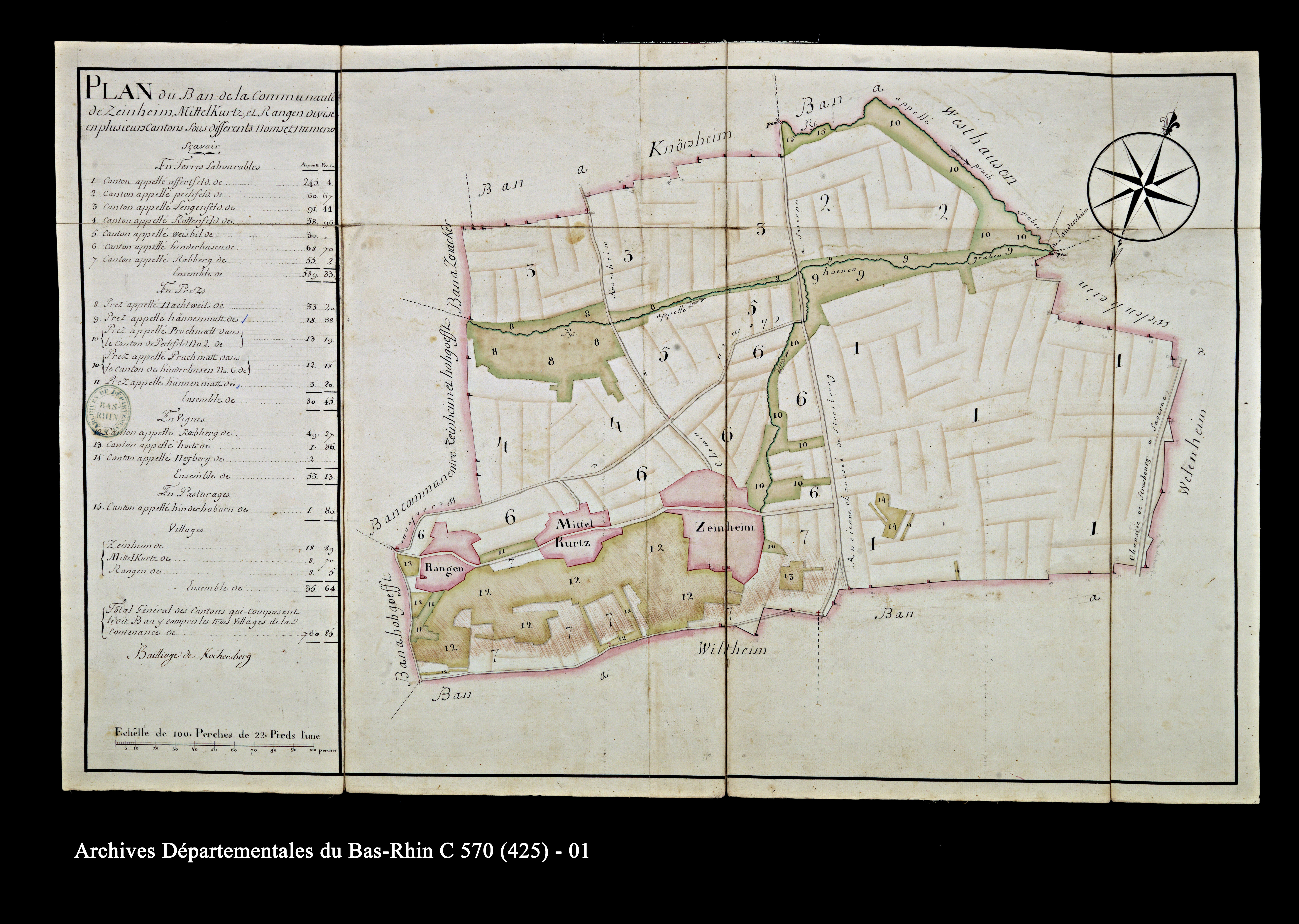 Plan d’arpentage du ban de la communauté de Zeinheim, Mittelkurtz et Rangen divisé en plusieurs « cantons », levé par le sieur Gouget, 1760