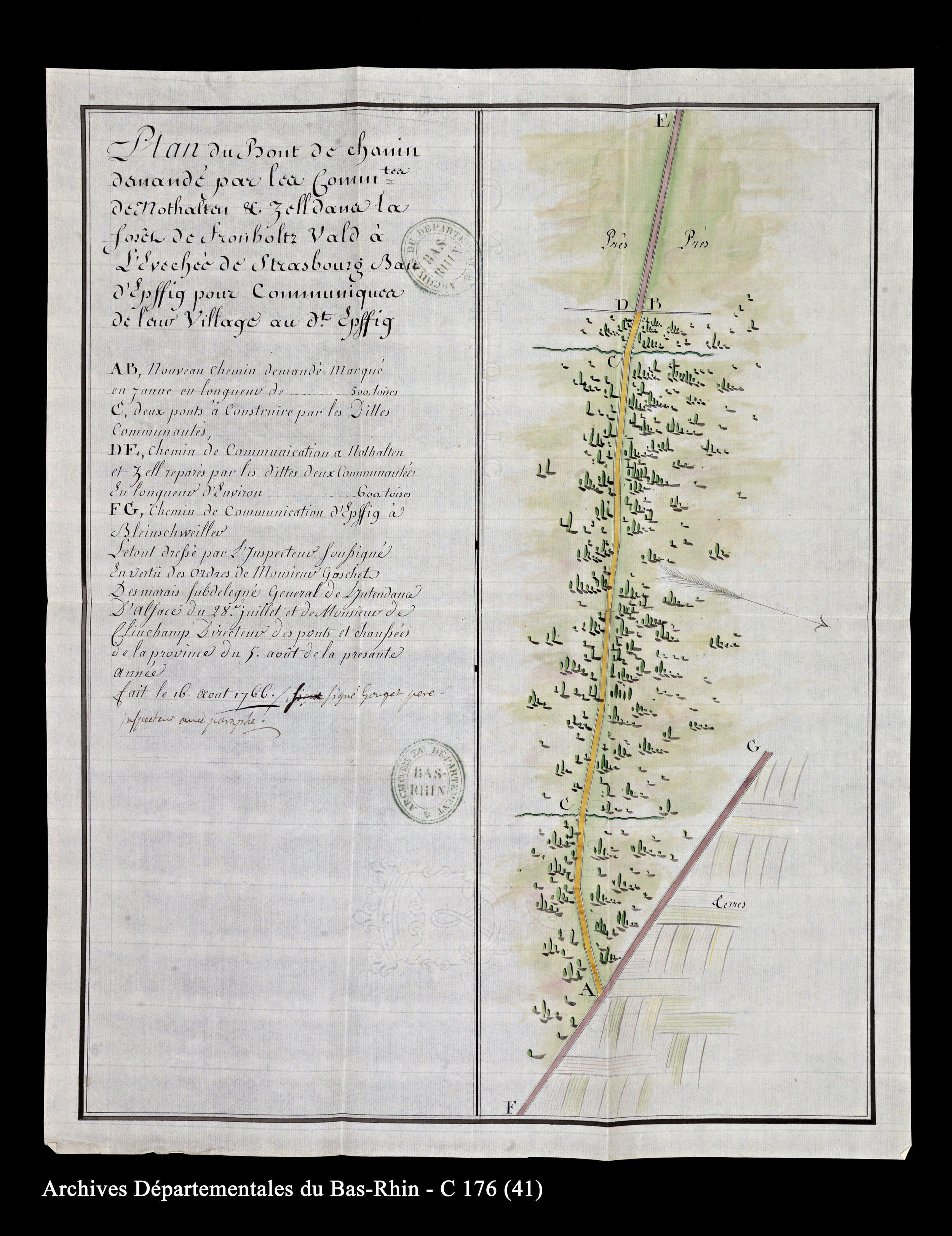 ADBR C 176 (pièce n°41). - Ici, le tronçon de route "AB" qui fait l'objet de la requête présentée par les communautés de Nothalten et de Zell est de couleur jaune, teinte dévolue aux projets. Les chemins sont identifiables par leur couleur marron.