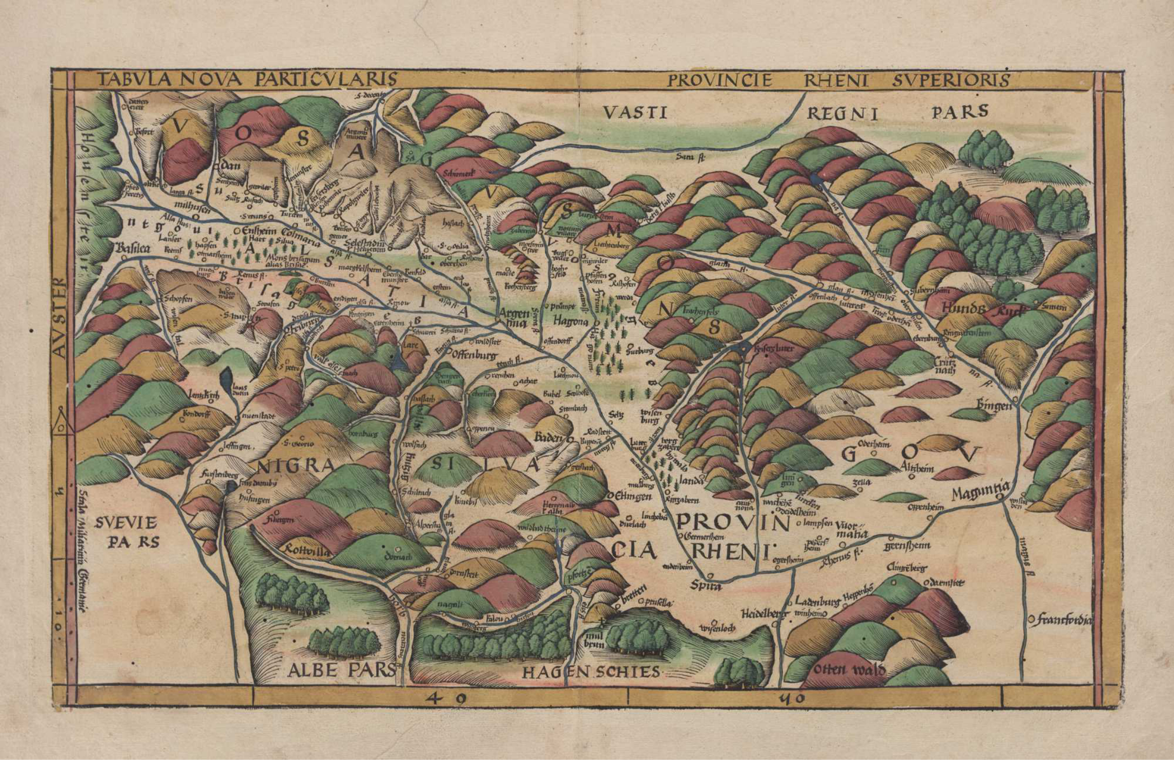 Tabula Nova Particularis Provincie Rheni Superioris, par Martin Waldseemüller. Carte imprimée à Strasbourg en 1513, original conservé à Coblence : Landesbibliothekszentrum Rheinland-Pfalz