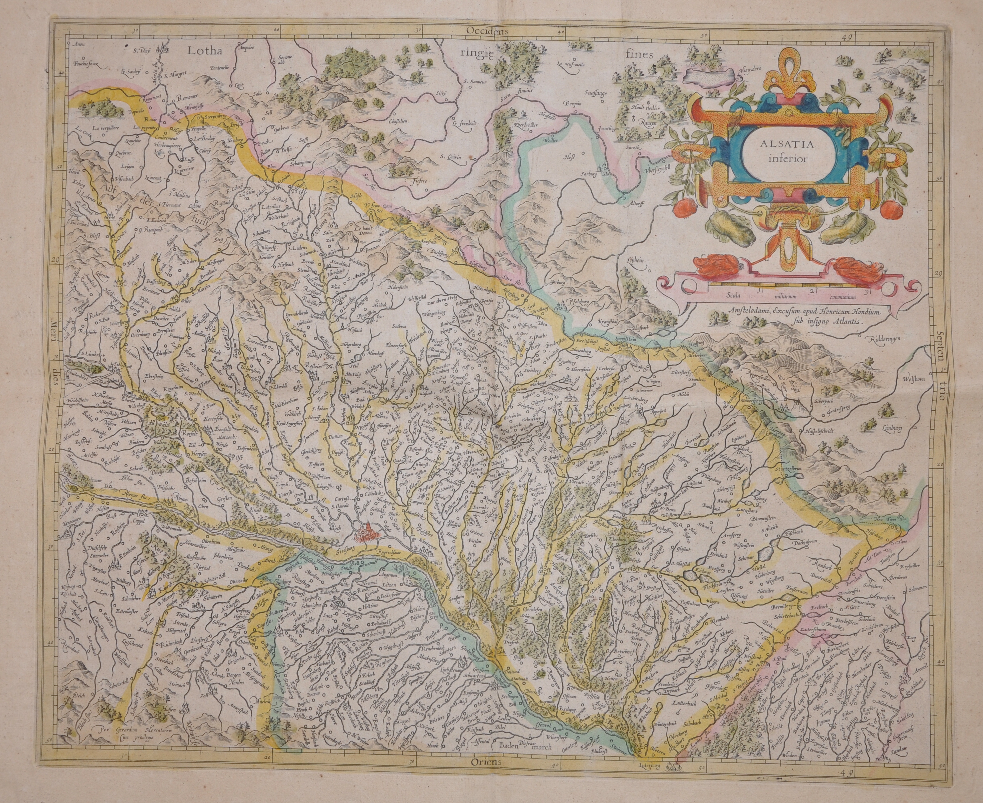 Carte coloriée de la Basse Alsace, avec commentaires en français, extraite de l’atlas de Gérard Mercator, imprimé à Amsterdam, [vers 1585]